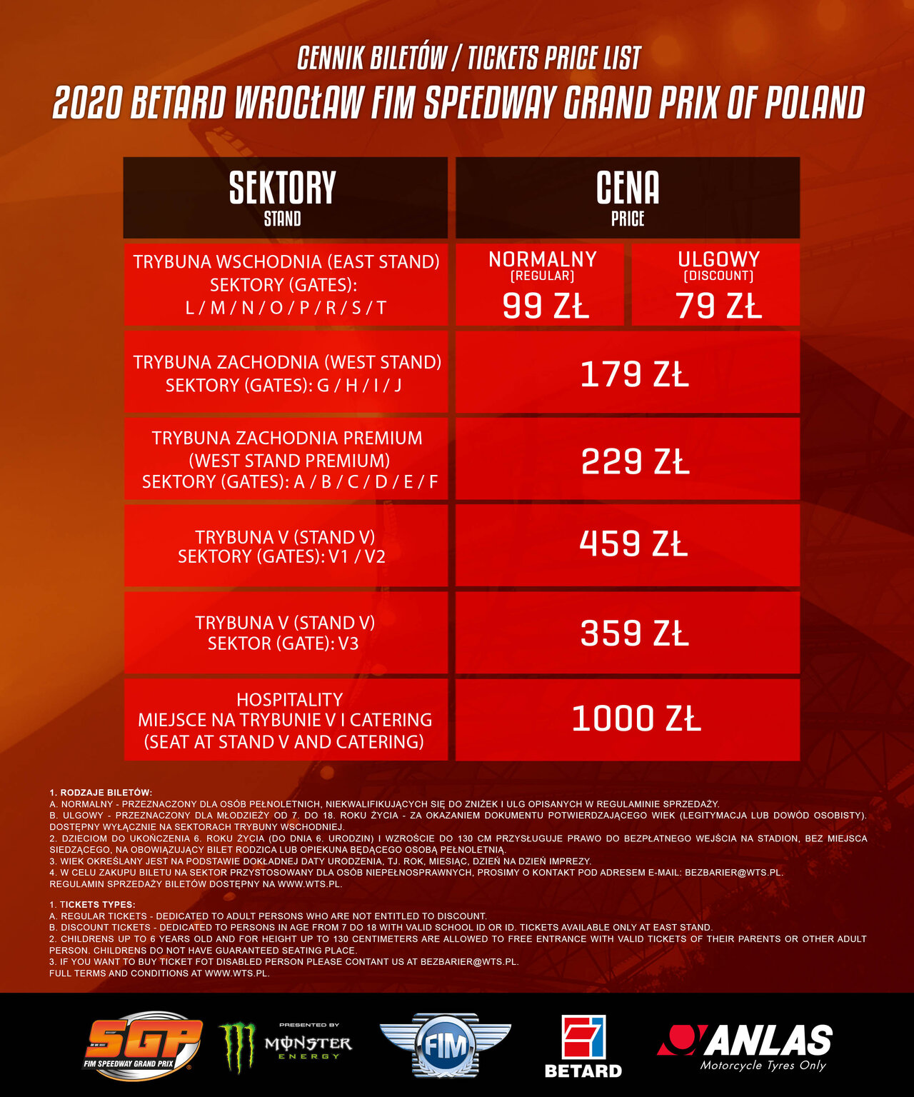 31 stycznia między godziną 13, a 17, w kasach stadionowych będzie możliwość stacjonarnego nabycia karnetu i biletu na 2020 Betard Wroclaw FIM Speedway Grand Prix. Od 4 lutego od godziny 13.00 sprzedaż będzie prowadzona przez stronę bilety.wts.pl oraz sieć punktów stacjonarnych – lista punktów dostępna tutaj.