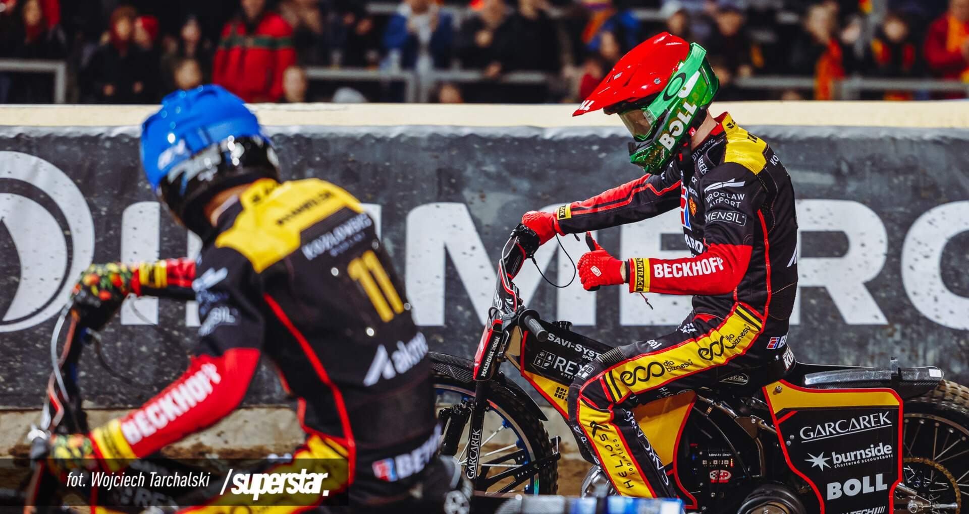Wyścig 8. padł łupem Artema Laguty, choć nie punktował Mikkel Andersen. W biegu 9. Spartanie zrobili wielkie show przed kibicami na Olimpijskim – choć start wygrali zawodnicy Stelmet Falubazu Zielona Góra, to Maciej Janowski i Brady Kurtz przecięli linię mety na dwóch pierwszych pozycjach. Kapitan Betard Sparty minął Dominika Kuberą na trzecim okrążeniu, a Australijczyk na samej linii mety. Tym samym wynikiem zakończyła się kolejna gonitwa – Bartłomiej Kowalski i Dan Bewley pokonali rywali z pierwszą przewagą. W tym momencie Betard Sparta Wrocław oficjalnie przypieczętowała meczowe zwycięstwo.